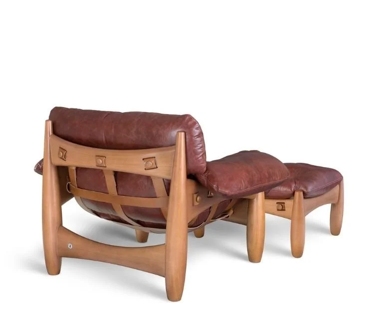 Estrutura: em madeira maciça composta e percintas ajustáveis em couro sola, botões em madeira torneada