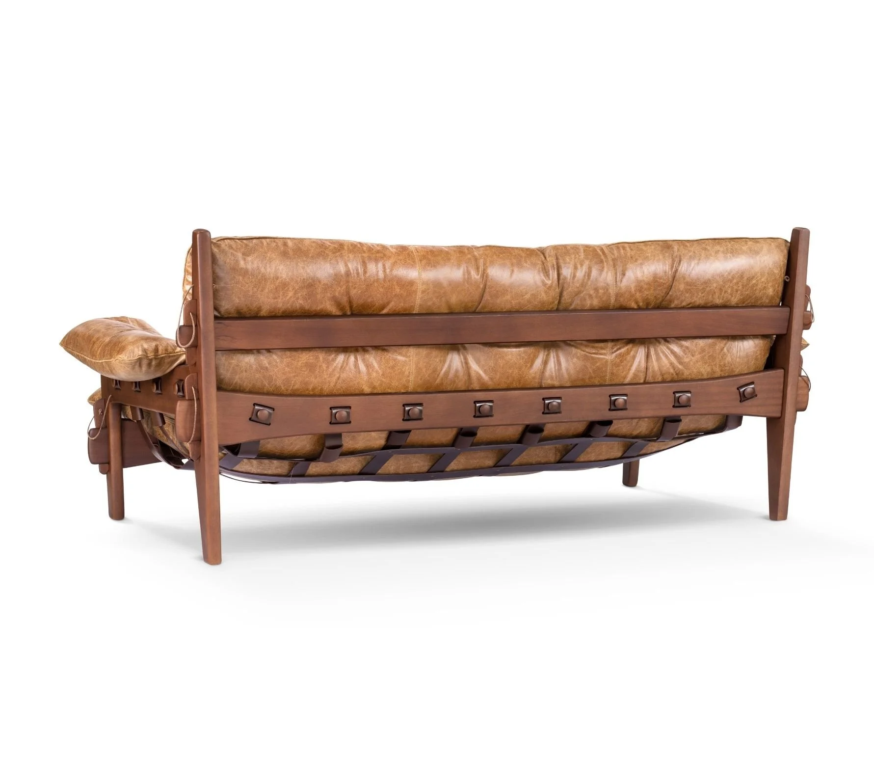 Estrutura: em madeira maciça composta e percintas ajustáveis em couro sola, botões em madeira torneada